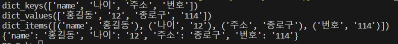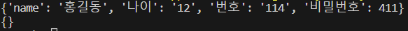 dic = {"name":"홍길동", "나이":"12","주소":"종로구","번호":"114"}
