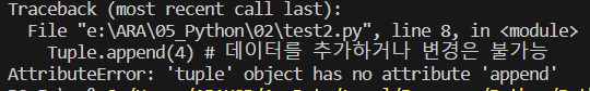 #Tuple.append(4) # 데이터를 추가하거나 변경은 불가능