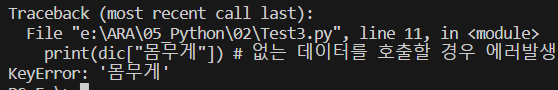 print(dic["몸무게"]) # 없는 데이터를 호출할 경우 에러발생