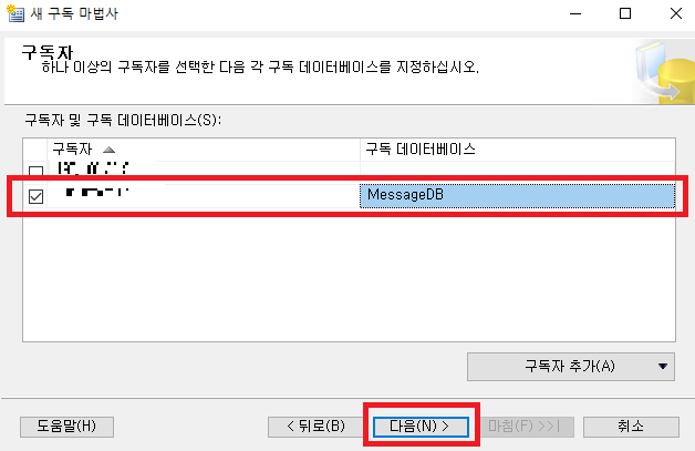 구독자 서버의 'MessageDB'라는 데이터베이스에 복제합니다.)